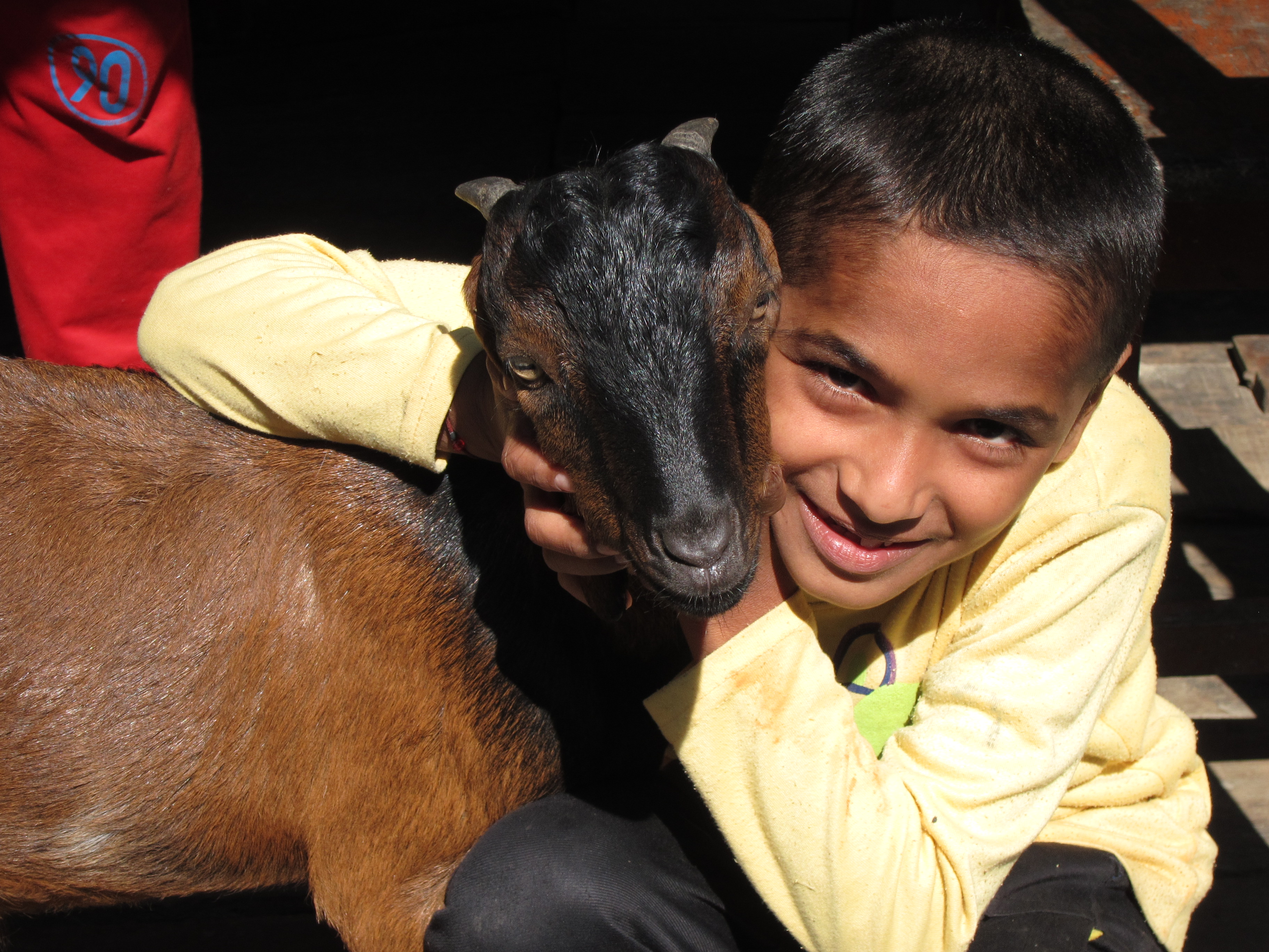 I was taking a photo of this baby goat when the child suddenly inserted himself into the scene. (I hope that goat can breathe! He's got her in a headlock).