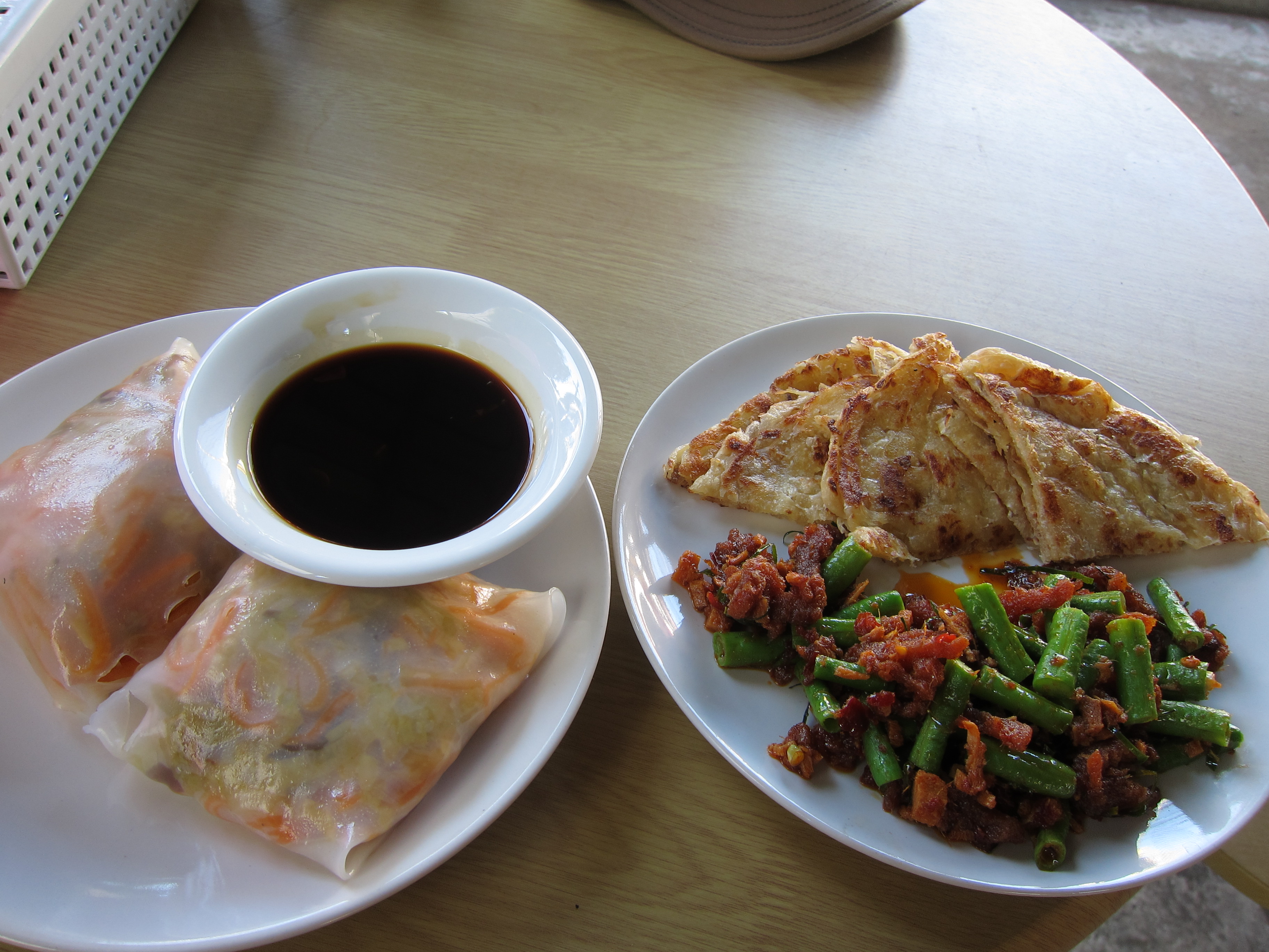 Shredded veggies wrapped in rice paper; roti and green beans with soy protein, at Khrua 14, Mae Sot.
