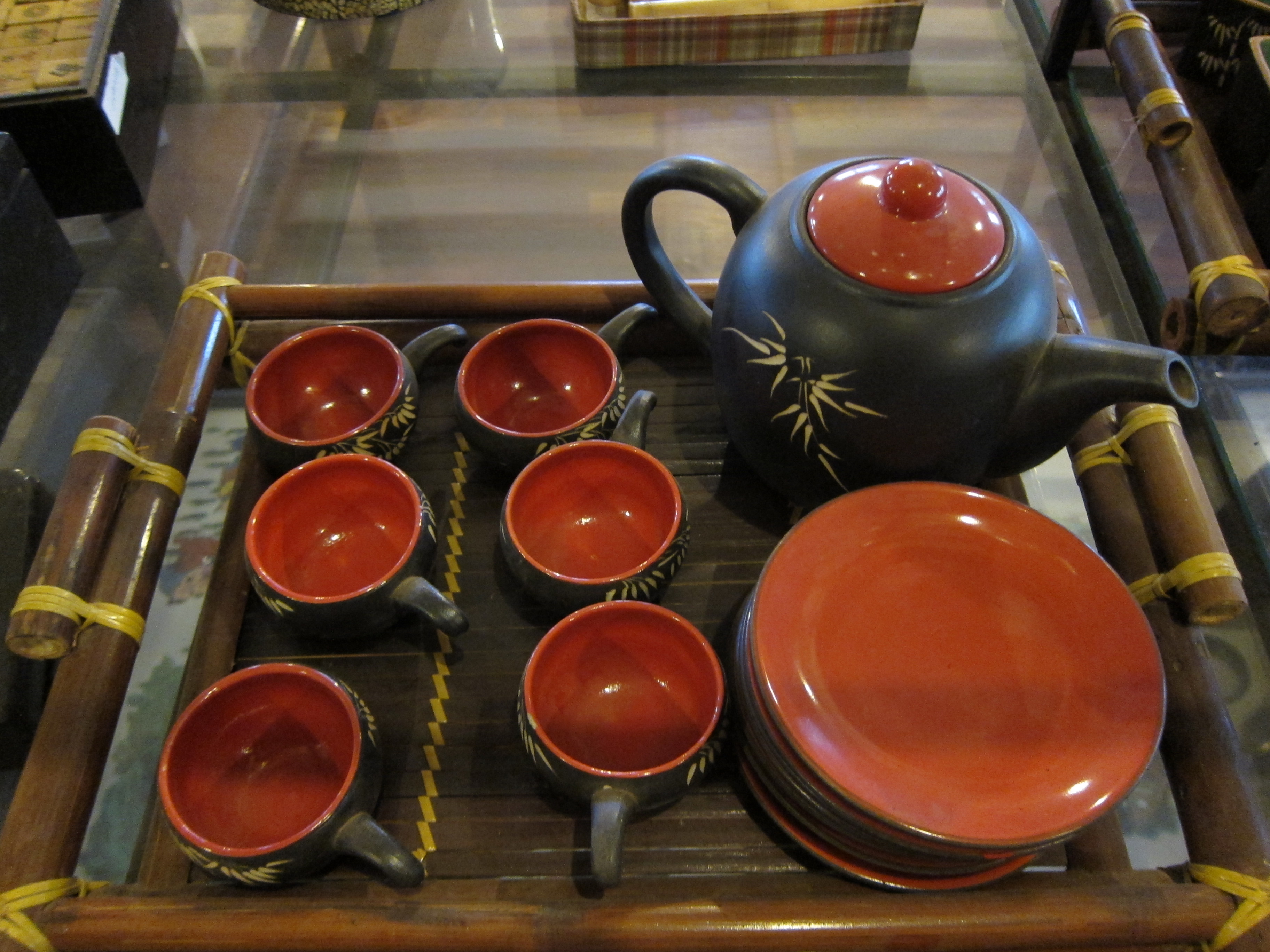 I passed several storefront shops selling handicrafts of various sorts. Taking shelter from a sudden morning downpour, I stepped into one of these shops (I can’t recall the name now) and sat for a while at its upstairs cafe overlooking the street. Back in the shop downstairs I got lost amid the giant carved wooden sculptures, antique Chinese Mahjong games and colorful tea sets.