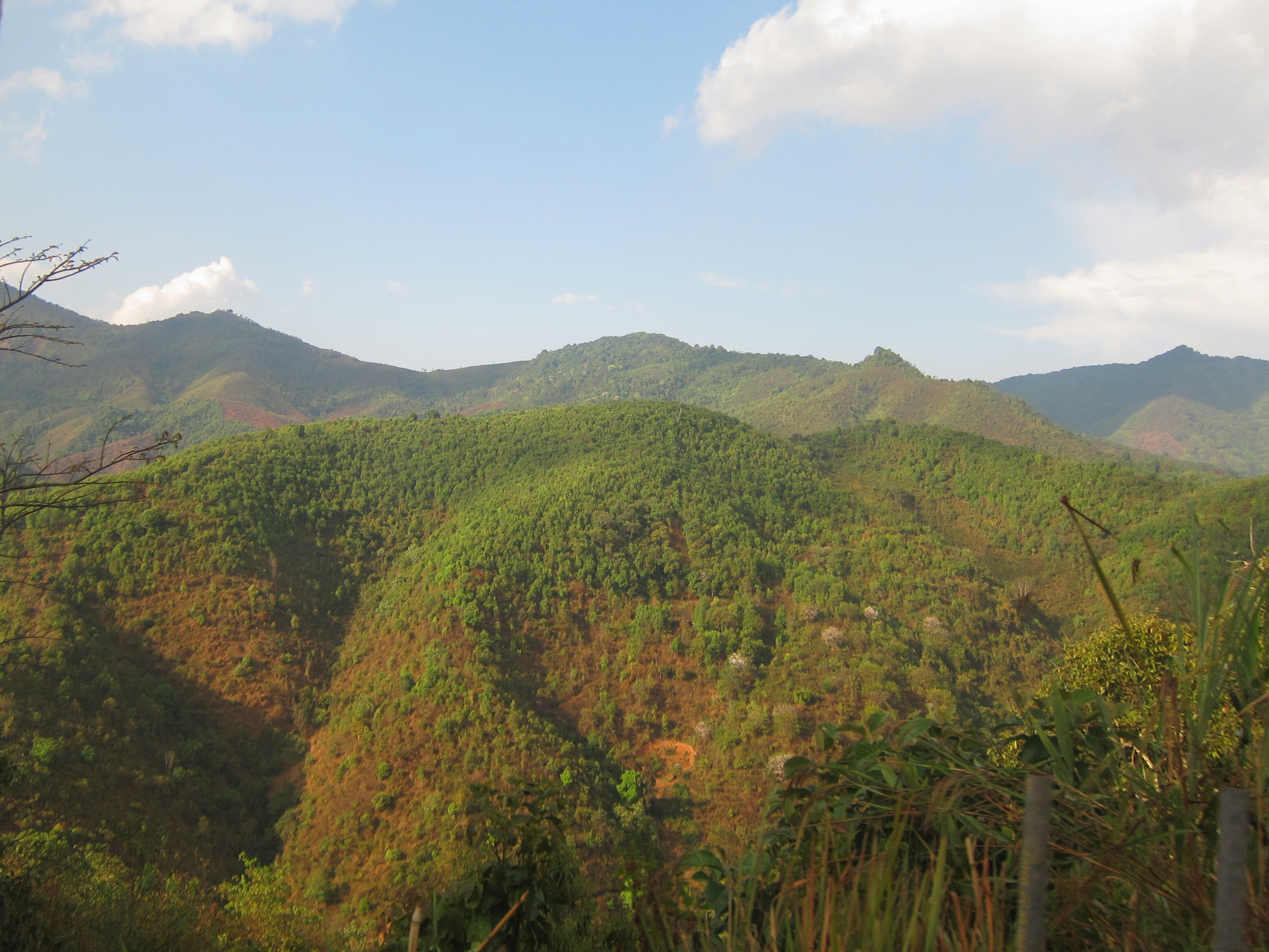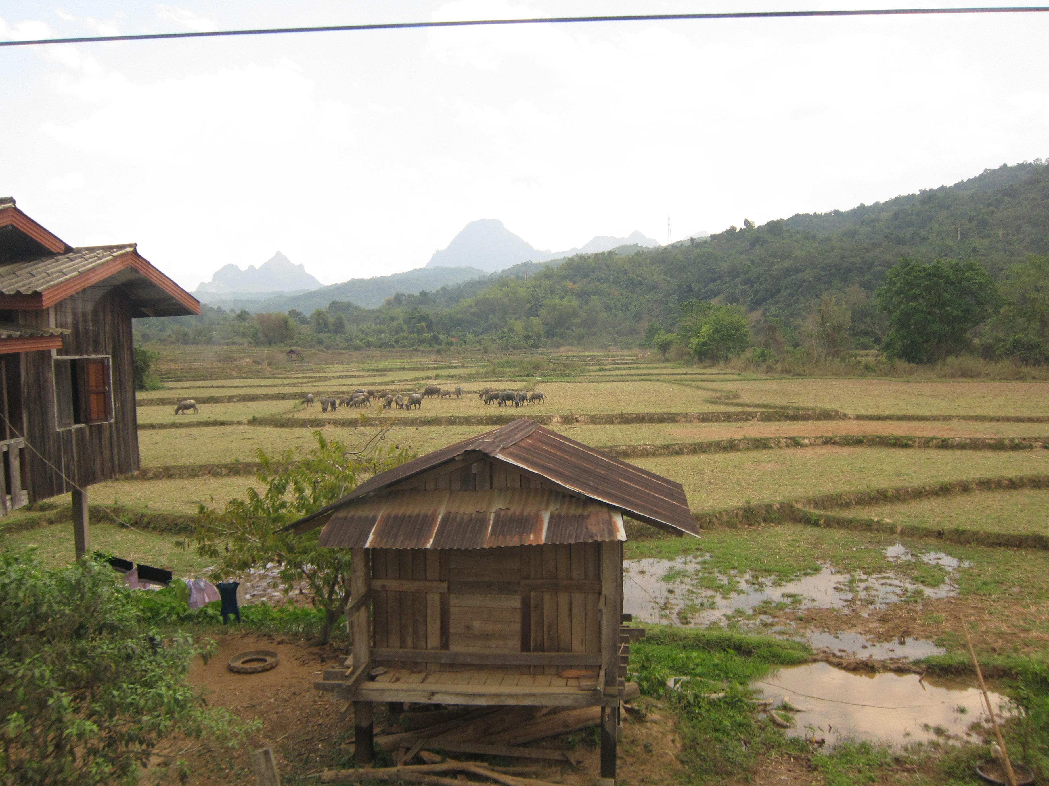 Yesterday I walked a few kilometers east to find some caves nearby. After paying five thousand kip (63 cents U.S.) for a ticket, I climbed up a steep staircase to reach the hollowed out areas in the cliffs. Today I walked a good distance in the other direction along a wide unpaved road winding around the nearby hills.